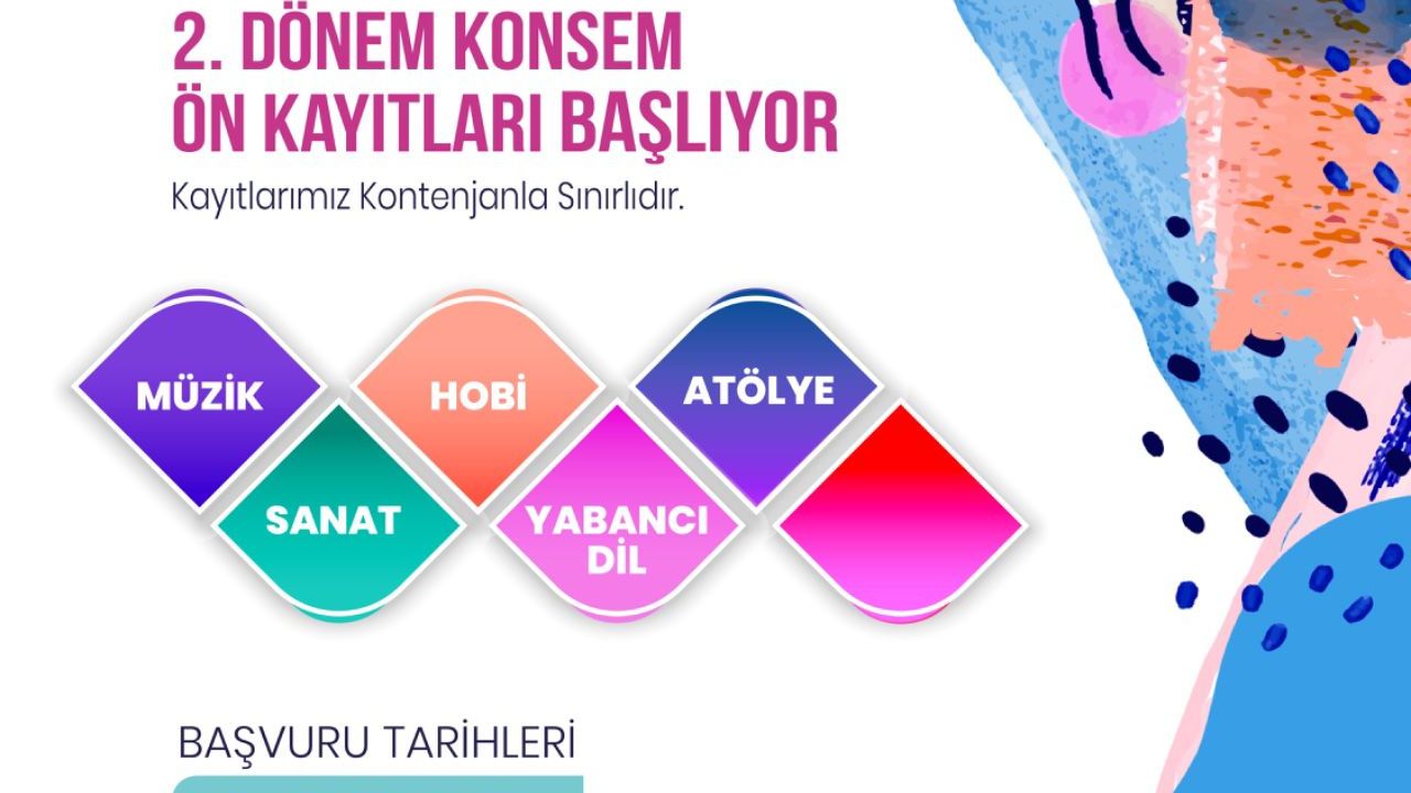 Konyaaltı Belediyesi bünyesindeki Konyaaltı Sanat Eğitim Merkezi’nde (KONSEM) yıl boyunca düzenlenen kurslar devam ediyor. Vatandaşlar, iki ayrı dönemde ücretsiz olarak gerçekleştirilen kurslarda yeni hobiler edinme fırsatı yakalıyor. Bu kapsamda Konyaaltı Belediyesi, kursların 2’nci dönem ön kayıt takvimini açıkladı. Başvuru tarihlerinin 2-6 Şubat tarihleri arasında olacağı ve kayıtların konyaalti.bel.tr internet adresinden yapılacağı duyuruldu. Müzik, sanat, hobi, yabancı dil ve atölye alanlarında yapılacak başvurular için kayıtların kontenjanla sınırlı olduğu, detaylı bilgi almak isteyen vatandaşların 0242 259 33 33 numaralı telefonu arayabileceği belirtildi.