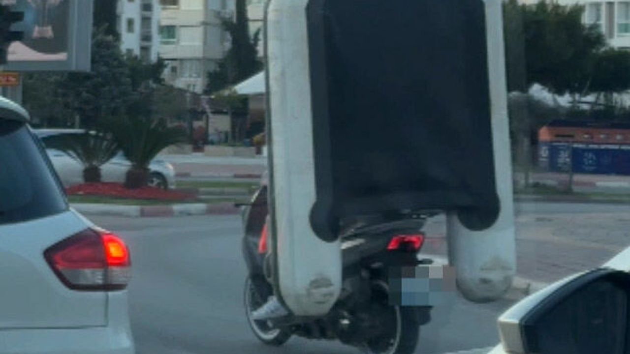 Antalya’da, Konyaaltı ilçesi Hurma mahallesi Boğaçay Caddesi üzerinde motosikletle seyir halindeki iki kişinin motosikletin arka kısmında şişme botla tehlikeli yolculuğu cep telefonu kamerasına yansıdı. Motosikletin arkasındaki yolcunun şişme botu sırtına yaslayıp, botun tutamak kısmına tutunduğu görülürken, şişme botun motosikletin arka görüşünü tamamen kapattığı dikkati çekti. Durumun trafikteki diğer araçların trafik güvenliğini tehlikeye düşürdüğü görüldü.
