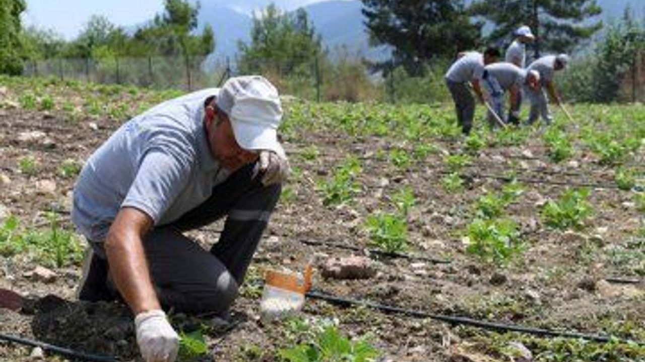 Konyaaltı Belediyesi'nin Çandır fasülyesinin yeniden hayat bulması için Yarbaşçandır Mahallesi'nde 5 bin metrekare alanda ektiği fasülyenin çapalama işlemi yapılıyor