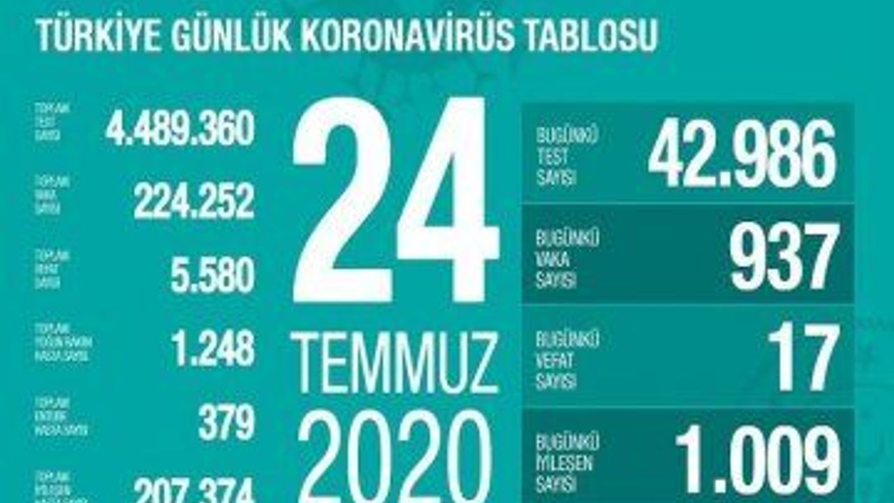 Sağlık Bakanı Fahrettin Koca, koronavirüs salgınında son 24 saatte yaşanan gelişeleri açıkladı. Verilere göre, Türkiye'de son 24 saatte korona virüs nedeniyle 17 kişi daha hayatını kaybetti, 937 yeni vaka tespit edildi. Böylece toplam can kaybı 5 bin 580'e, toplam vaka sayısı ise 224 bin 252'ye yükseldi. Bakan Koca, sosyal medyada yaptığı açıklamada 'Toplam test sayımız 4,5 Milyona yaklaştı. İyileşen hasta sayımızla yeni vaka sayımız arasındaki fark, DÜNE KIYASLA AZALDI. Yoğun bakım ve entübe hasta sayımız; erken tanı, yaş, kronik hastalık ve benzeri durumlara bağlı olarak düşüş ve yükseliş gösteriyor.' ifadelerini kullandı.