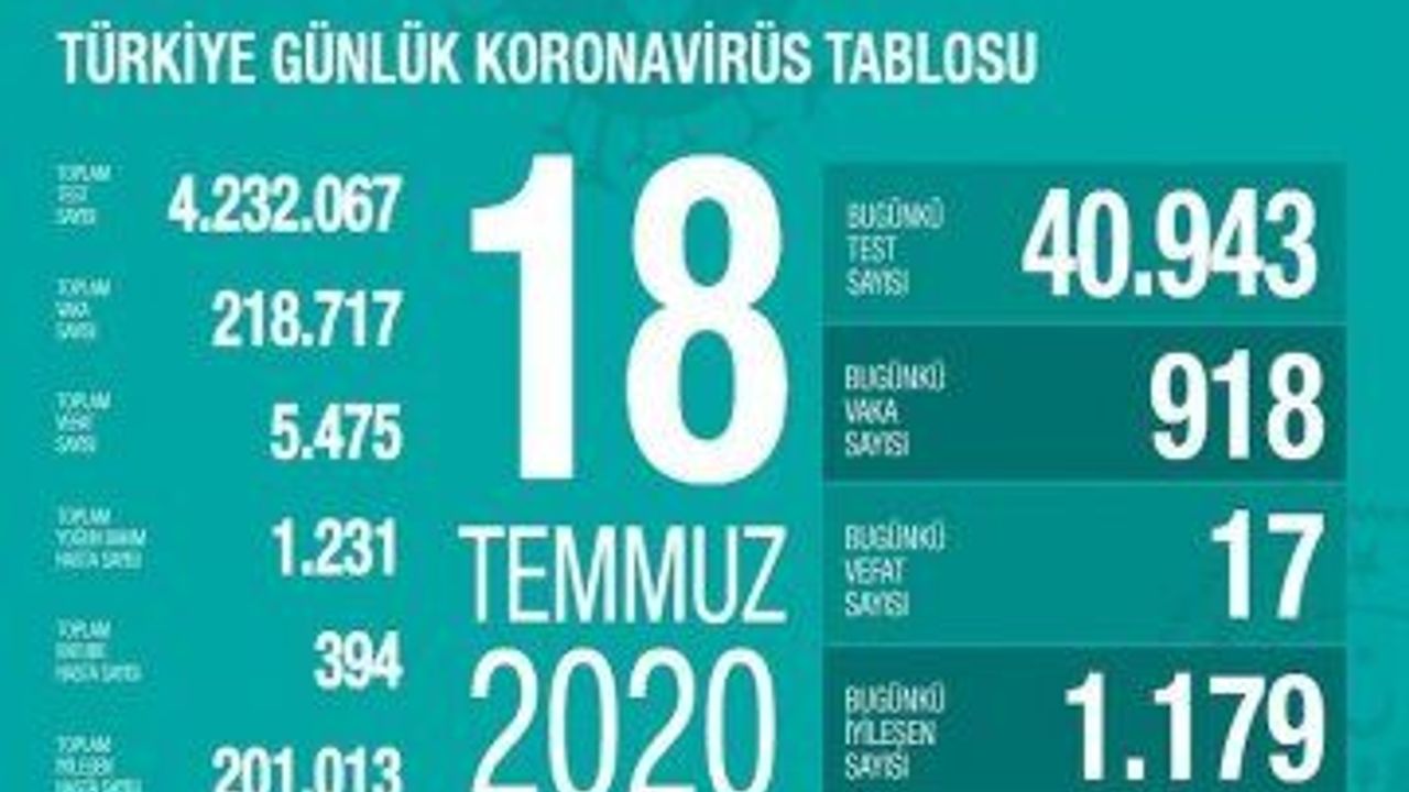 Sağlık Bakanı Fahrettin Koca, Türkiye'de Koronavirüs nedeniyle 17 kişinin daha hayatını kaybettiğini, 918 yeni vaka tespit edildiğini açıkladı. Böylece toplam ölü sayısı 5 bin 475'e, vaka sayısı 218 bin 717'ye yükseldi. Sağlık Bakanı Koca, yeni tip Koronavirüs'ün (Covid-19) Türkiye'deki güncel durumuna ilişkin Sağlık Bakanlığı'nın verilerini paylaştı.