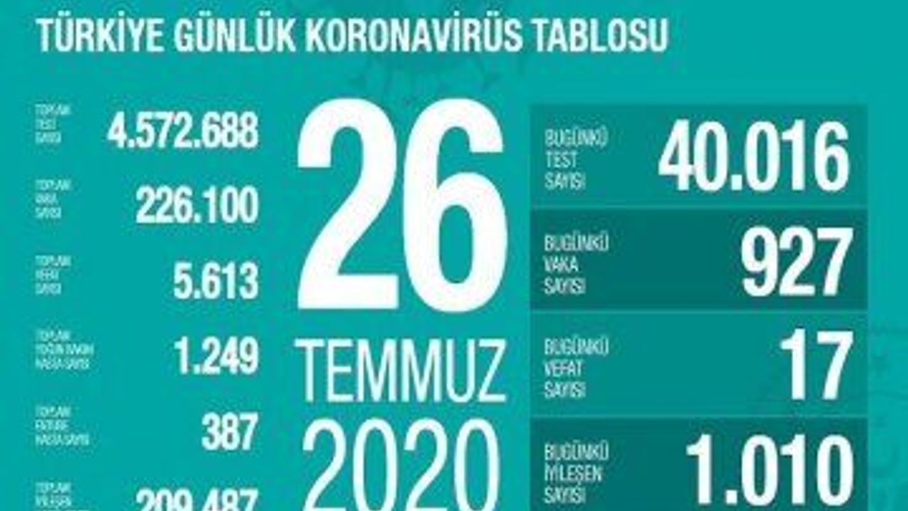 Sağlık Bakanı Fahrettin Koca, Türkiye'de Koronavirüs nedeniyle 17 kişinin daha hayatını kaybettiğini, 927 yeni vaka tespit edildiğini açıkladı. Böylece toplam ölü sayısı 5 bin 613'e, vaka sayısı 226 bin 100'e yükseldi. Sağlık Bakanı Koca, yeni tip Koronavirüs'ün (Covid-19) Türkiye'deki güncel durumuna ilişkin Sağlık Bakanlığı'nın verilerini paylaştı.