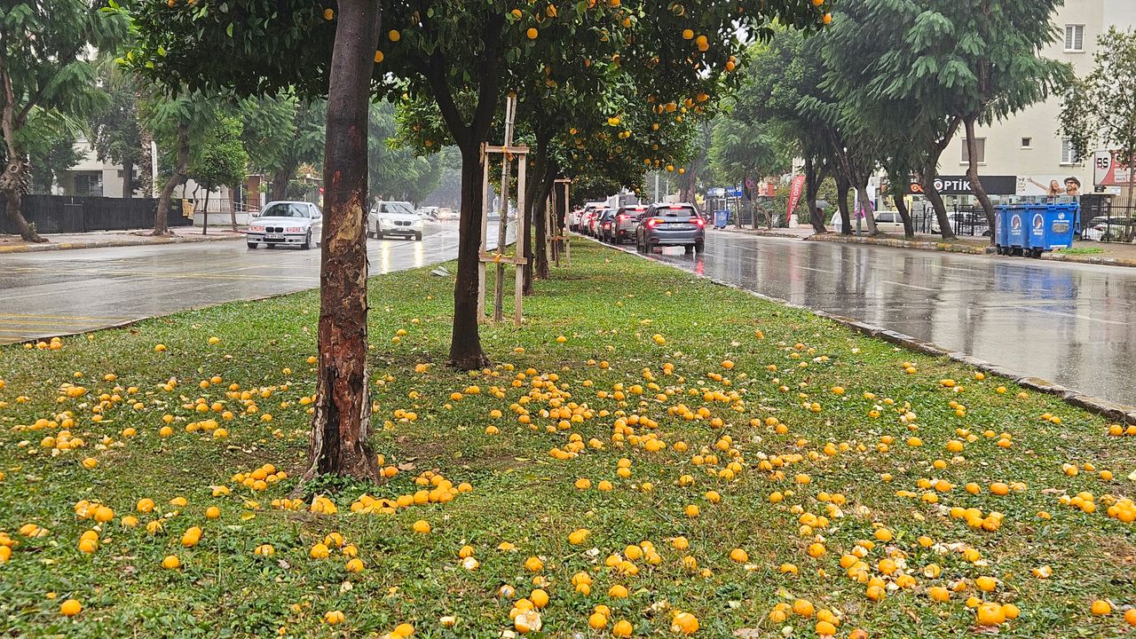 Meteoroloji 4'üncü Bölge Müdürlüğü'nün uyarı yaptığı Antalya'da sağanak ve yer yer gök gürültülü sağanak öğle saatlerinde etkisini gösterdi. Kuvvetli yağış ve rüzgar kentin simgesi olan turunç ağaçlarının meyvelerinin dökülmesine neden oldu. Turuncu rengi ve görselliğiyle Antalya'da caddeleri süsleyen turunçların refüjlere dökülmüş görüntüsü farklı bir görsel güzellik de oluşturdu.