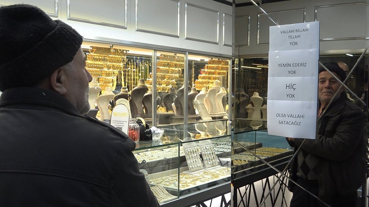 Kuyumcu Ahmet Yasinkılıç, "Altında yaşanan sert düşüş talebi arttırınca, sabah yoğunluk yaşandı. Akşam olmadan gram, çeyrek altın tükendi. Şimdi vatandaşlar bizim altını stokladığımızı düşünüyor. Halbuki, şu an altın alacağımız tedarikçide altın kalmadı. Biz de artık yemin etmekten yorulduk. Çareyi cama yazı asmakta bulduk" dedi.