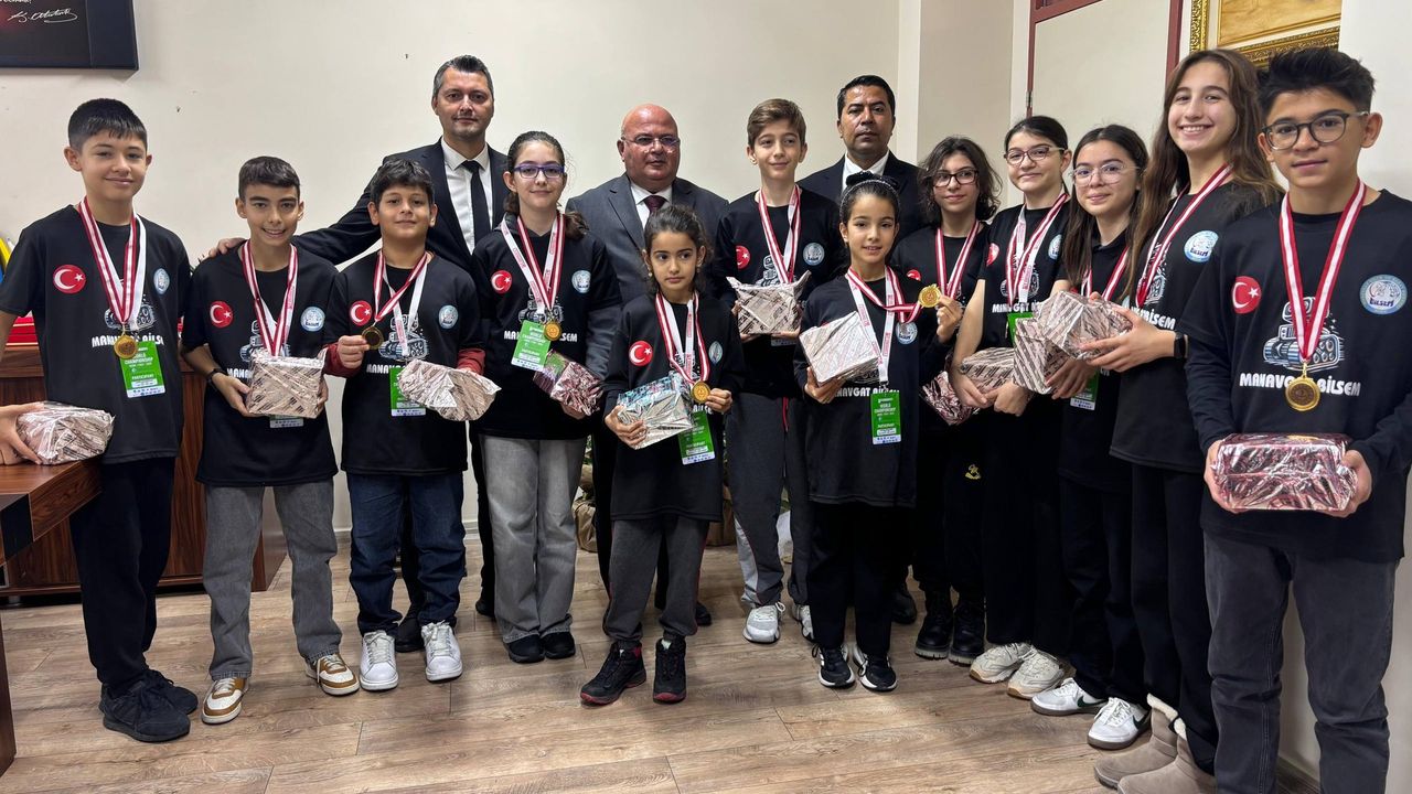 Başarılı öğrenciler, Manavgat İlçe Milli Eğitim Müdürü Ali Hakan Öz’ü makamında ziyaret etti. Ali Hakan Öz öğrencilere çeşitli hediyeler takdim etti. Müdür Öz, öğrencilerle tek tek ilgilenerek başarılarını kutladı.
