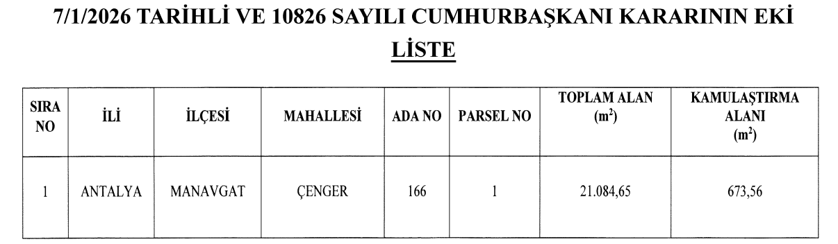 RESMİ Gazete’nin 8 Ocak 2026 tarihli sayısında yayımlanan 10826 sayılı Cumhurbaşkanı Kararı ile Antalya'da yeni bir kamulaştırma süreci başlatıldı. Cumhurbaşkanı Recep Tayyip Erdoğan’ın imzasıyla yayımlanan karara göre, 'Antalya Alanya Çenger Turizm Merkezi' sınırları içerisinde bulunan özel mülkiyete konu bir taşınmaz, turizm yatırımı gerçekleştirilmesi amacıyla kamulaştırılacak.