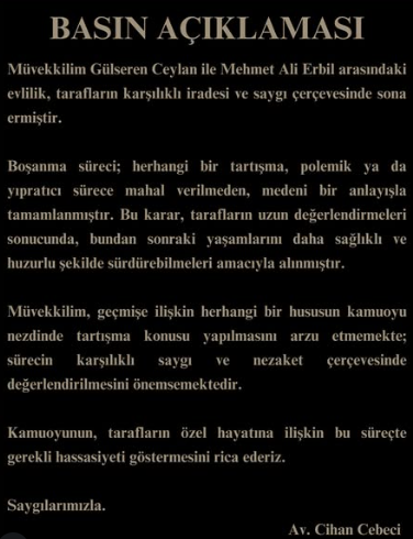 Mehmet Ali Erbil'in boşanma sonrası ilk açıklaması merakla beklenirken Gülseren Ceylan cephesinden "Medeni bir şekilde ayrıldık" mesajı geldi.