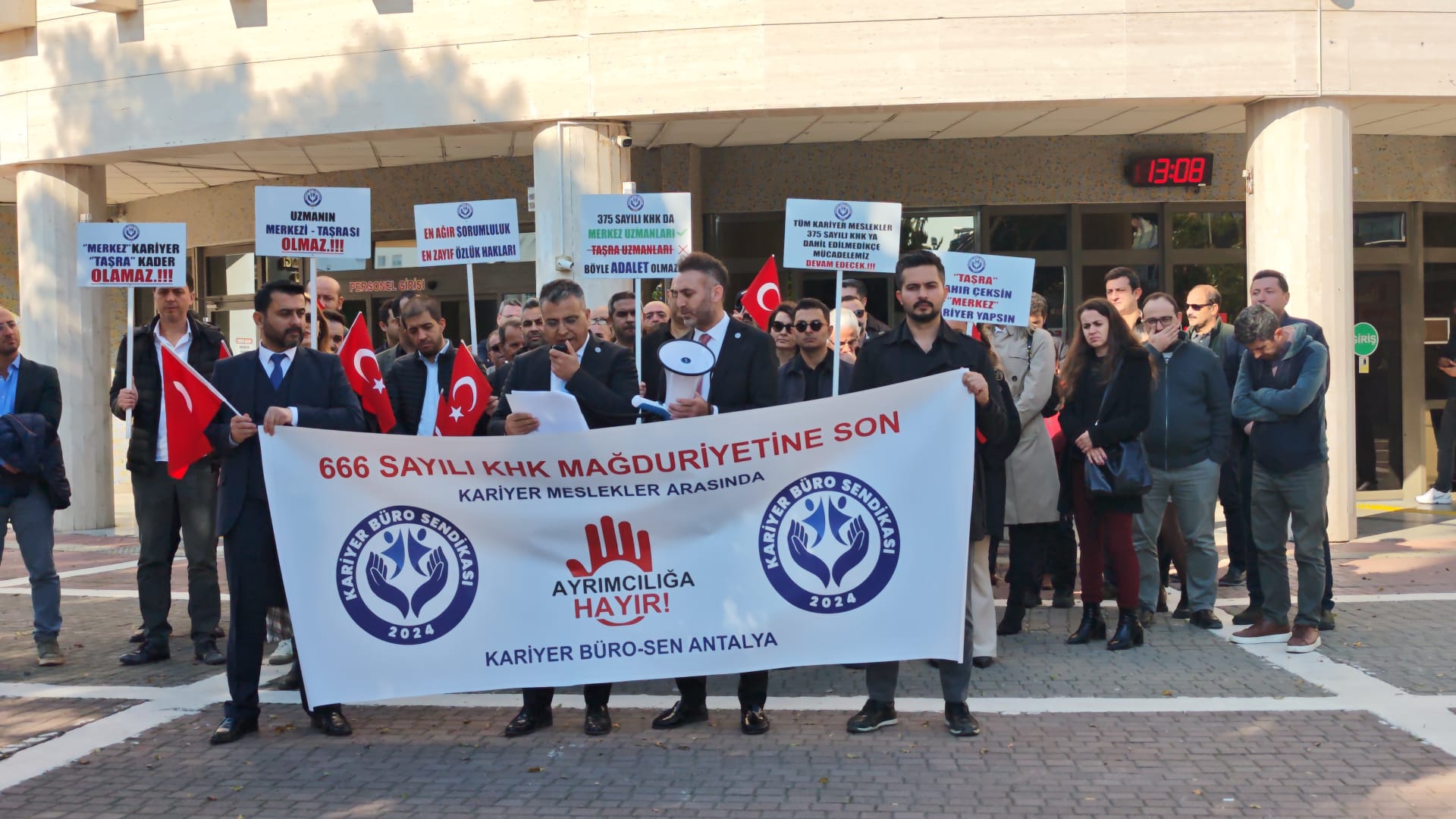 Eylemde konuşan Kariyer Büro Sendikası Antalya İl Temsilcisi İhsan Pardı, “2011 yılında çıkarılan 666 sayılı KHK ile aynı bakanlıkta uzman olarak görev yapan ancak ‘taşra’ diye adlandırılan kariyer mesleklerin yaşadığı mağduriyet söz konusudur. Bu, mağdur kariyer mesleklerin en haklı mücadelesidir. Gelinen noktada, 375 sayılı KHK’nin 2 ve 3 sayılı cetvellerinde yer alan üst kademe yöneticiler, merkez uzmanları ve müfettişlere 30.000 TL iyileştirme öngören yasa teklifi, Plan ve Bütçe Komisyonu’nun son gününde kabul edilmiş ve Türkiye Büyük Millet Meclisi’ne gönderilmiştir. Kariyer Büro Sendikası, yıllardır mağdur edilen kariyer mesleklerin de bu düzenlemeye eklenmesi gerektiğini, aksi takdirde bu düzenlemenin çalışma barışını büyük ölçüde bozacağını komisyondan geçtiği ilk gün dile getirmiştir. Bu konu ile ilgili daha önce de benzer adımlar atılmış, fakat taşra kariyer meslekler hep kapsam dışı bırakılmıştır” dedi.