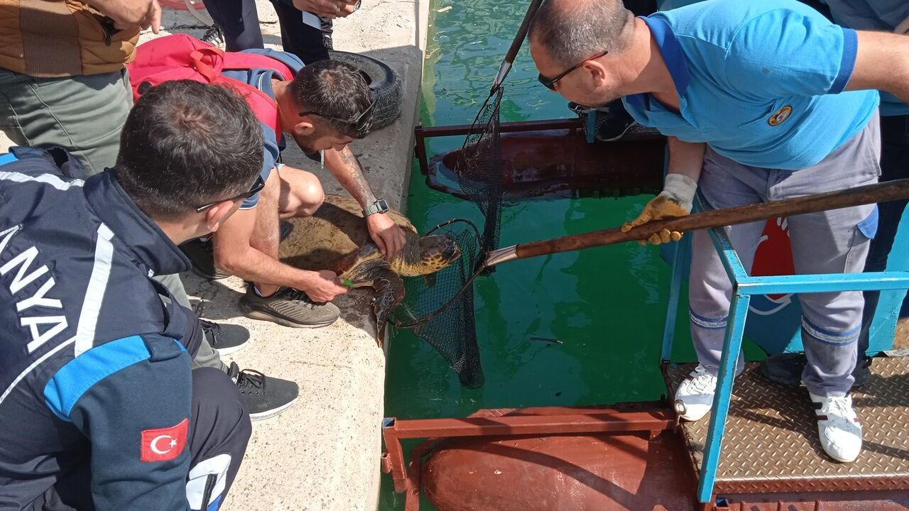 Misinadan kurtularak özgürlüğüne kavuşan caretta, Deniz Kontrol Ekibi ve Sahil Güvenlik Ekibi eşliğinde liman dışına götürülerek denize bırakıldı.