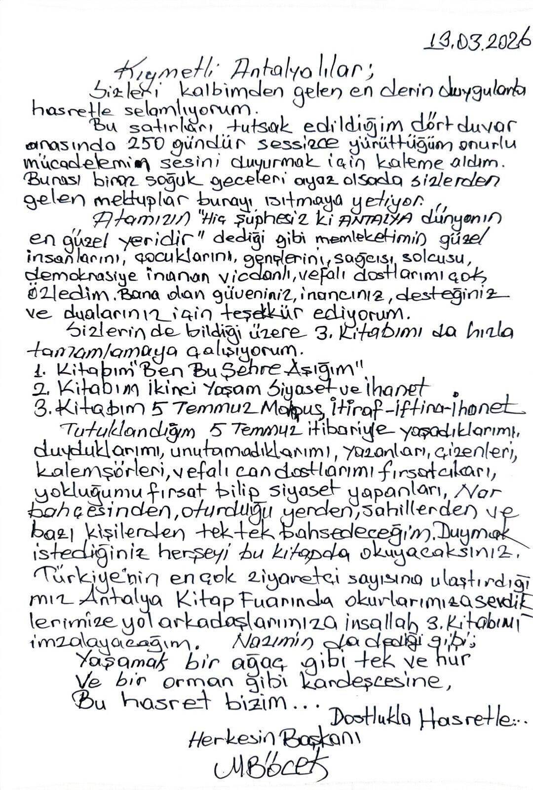 Cezaevinde tutukku bulunan Muhittin Böcek, sosyal medya hesabından mehtup yayımadı. Muhittin Böcek mektubunda şu ifadeleri kullandı; "Kıymetli Antalyalılar, sizleri kalbimden gelen en derin duygularla hasretle selamlıyorum. Bu satırları tutsak edildiğim dört duvar arasında 250 gündür sessizce yürüttüğüm onurlu mücadelemin sesini duyurmak için kaleme aldım. Burası biraz soğuk, geceleri ayaz olsa da sizlerden gelen mektuplar burayı ısıtmaya yetiyor. Ata'mızın "Hiç şüphesiz ki Antalya dünyanın en güzel yeridir" dediği gibi memleketimin güzel insanlarını, çocuklarını, gençlerini, sağcısı-solcusu, demokrasiye inanan vicdanlı, vefalı dostlarımı çok özledim. Bana olan güveniniz, inancınız, desteğiniz ve dualarınız için teşekkür ediyorum."