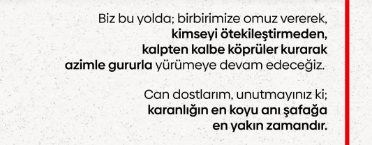 Mesajının son bölümünde Antalyalılara ‘can dostlarım’ diye hitap eden Başkan Böcek, "Unutmayınız ki karanlığın en koyu anı şafağa en yakın zamandır” dedi.