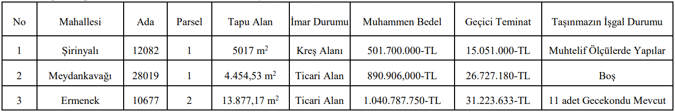İhale listesinde belirtilen bilgilere göre, Meydankavağı’ndaki taşınmaz boş vaziyetteyken Şirinyalı’daki alanda muhtelif ölçülerde yapılar, Ermenek’teki alanda ise 11 adet gecekondu bulunuyor. İhaleye ilişkin teknik detayları içeren şartname, belediyenin Emlak ve İstimlak Müdürlüğü’nden 5.000,00-TL bedel karşılığında temin edilebiliyor. İhaleye katılacak isteklilerin belirtilen gün ve saatte Beyaz Salon’da hazır bulunmaları şart.