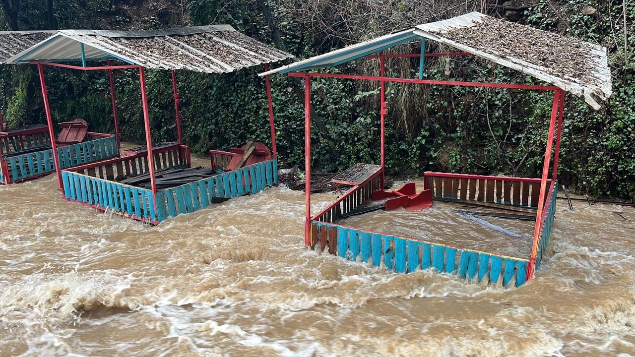 Alanya'nın Oba Mahallesi Alacami çevresinde dün akşam etkili olan sağanak yağışın ardından Oba Çayı taştı. Kısa sürede debisi yükselen çayın taşmasıyla birlikte dere yatağına yakın iki işletmeye ait çardaklar sular altında kaldı. İşletmelerde hasar meydana gelirken, yaşanan su baskını dron ile görüntülendi.