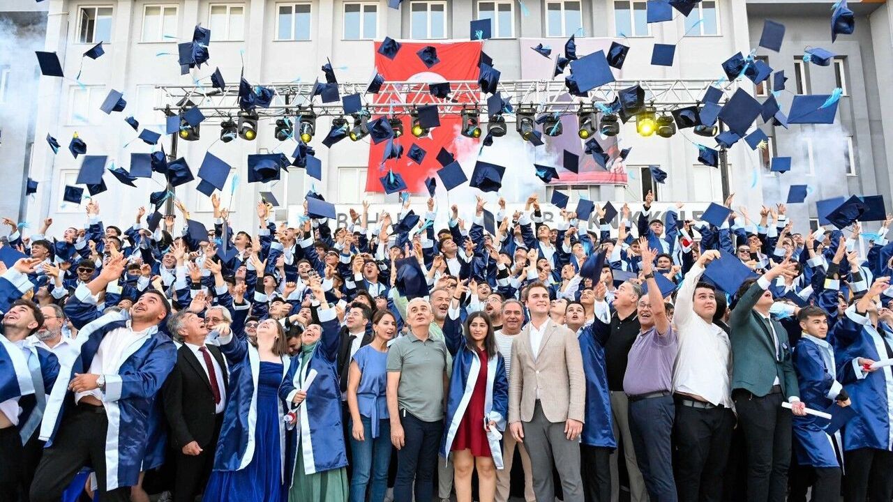 Ali Bahar Antalya OSB Teknik Koleji, ilk mezunlarını verdi. Okul bahçesini dolduran öğrenciler keplerini coşku ve gururla havaya fırlattı