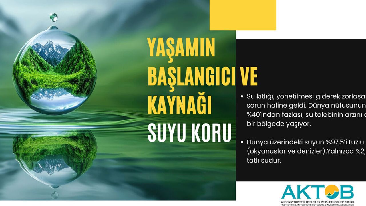 AKTOB, '1 Damla 1 Dünya' ismiyle Antalya genelindeki tüm otellerde su tasarrufu projesi başlatıyor. Projenin startı, kasım ayındaki AKTOB'un Turizm Resort Kongresi'nde verilecek. Antalya 1146'sı turizm işletme belgeli olmak üzere basit konaklama belgeli tesislerle birlikte toplam 2 bin 760 otel ve 656 bin 212 yatak sayısıyla Türkiye'nin ve dünyanın en önemli turizm kentlerinden biri konumunda. Tüm bu otellerde toplam 306 bin 532 oda bulunuyor ve bunların 255 bin 721'i AKTOB üyesi turizm ve yatırım işletme belgeli otellerdeki odalardan oluşuyor.