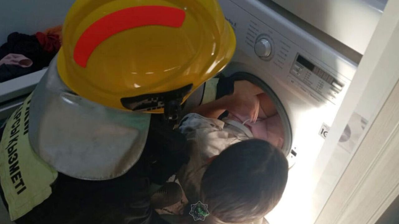Kazakistan'ın Ridder kentinde evde tek başına kalan iki kız çocuğundan biri oyun oynarken çamaşır makinesinin tamburuna sıkıştı. Diğer çocuk, arkadaşının sıkışması üzerine acil yardım numarasını arayarak ekiplerden yardım istedi.