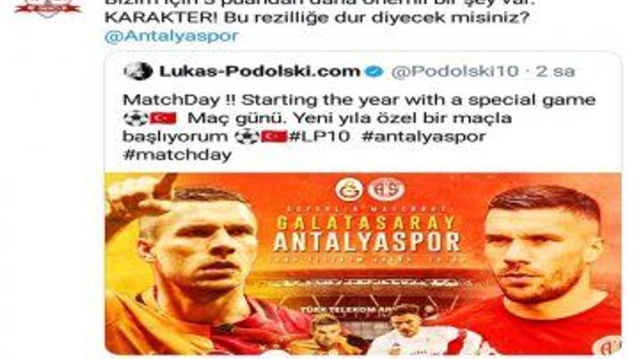 SÜPER Lig ekiplerinden Fraport TAV Antalyaspor'da forma giyen Podolski bu akşam oynanacak Galatasaray maçı öncesi sosyal medya paylaşımıyla tepki çekti. Yıldız futbolcunun Galatasaray ve Fraport TAV Antalyaspor formasıyla fotoğrafının altına 'Maç günü. Yeni yıla özel bir maçla başlıyorum' ifadelerini paylaştı. Podolski'nin paylaşımını Fraport TAV Antalyaspor taraftarları eleştirdi.
