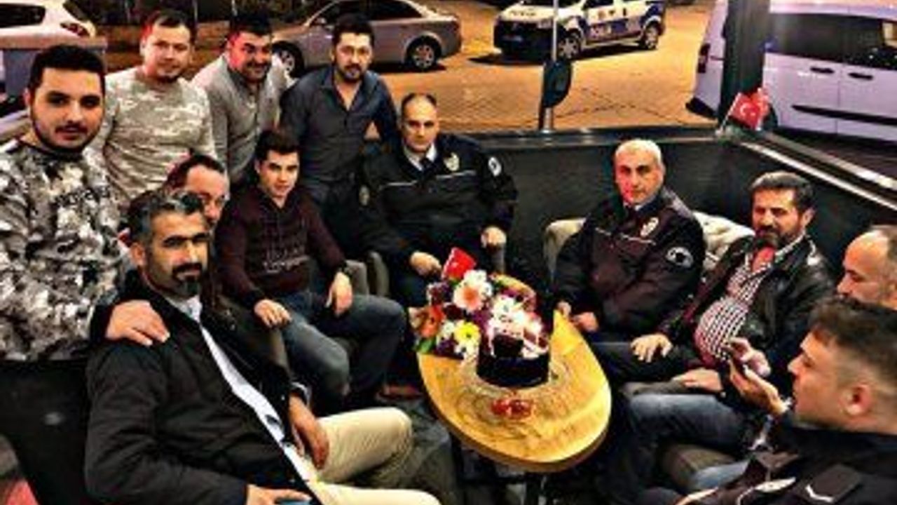 İhbarı alan ve 2 ekip aracıyla olay yerine gelen polis ekiplerini gören grup, konfetiler ve maytaplarla kutlama yaptı. Sürpriz karşısında şaşıran polis memurları ekip araçlarından inerken, gruptakiler de onların Polis Haftası'nı kutladı.