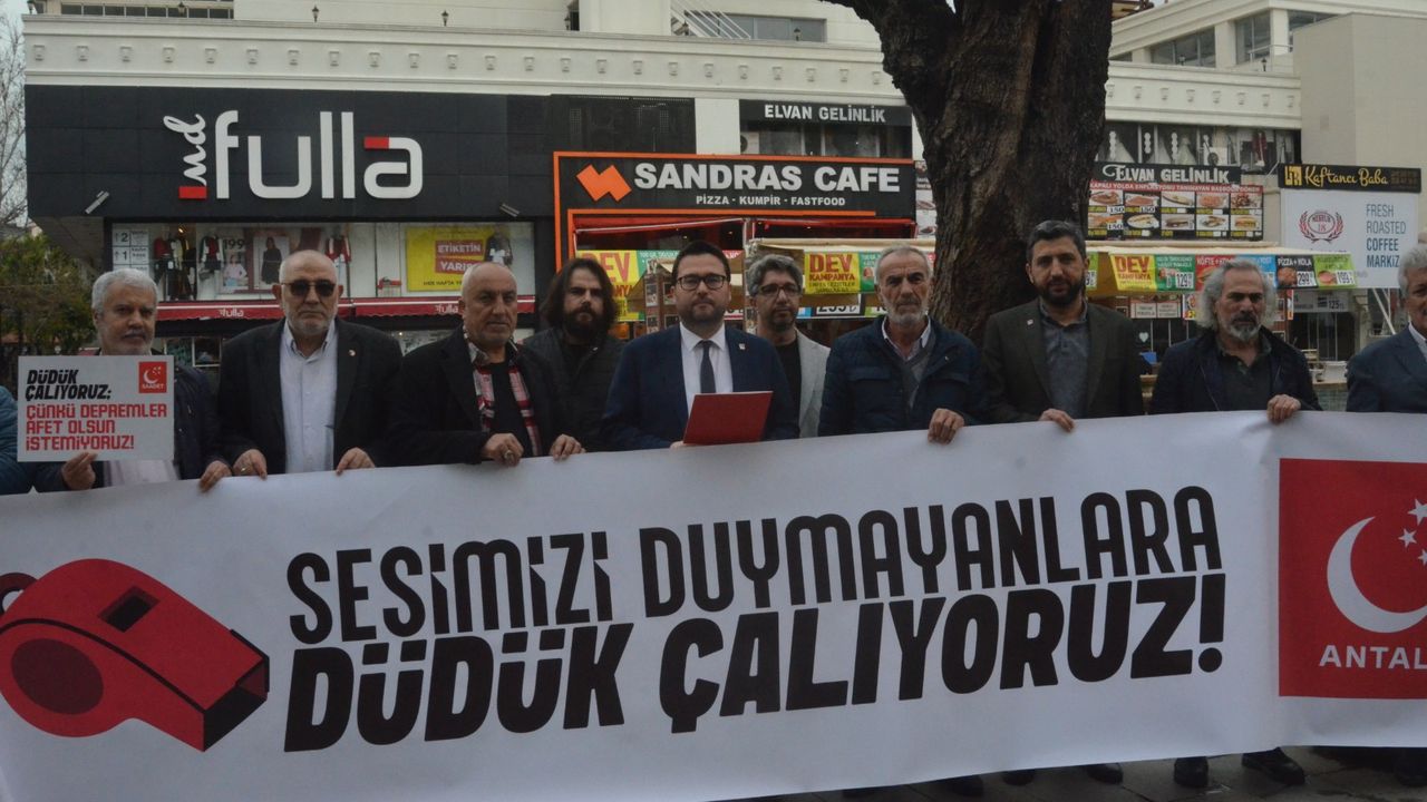 SAADET Partisi Antalya İl Başkanı Mehmet Fatih Tekin, 6 Şubat depremlerinin yıldönümüne yaklaşılırken yaptığı basın açıklamasıyla Türkiye’nin deprem gerçeği karşısında iktidarın politikalarını eleştirdi. Açıklama “Sesimizi Duymayanlara Düdük Çalıyoruz” başlığıyla yapıldı.