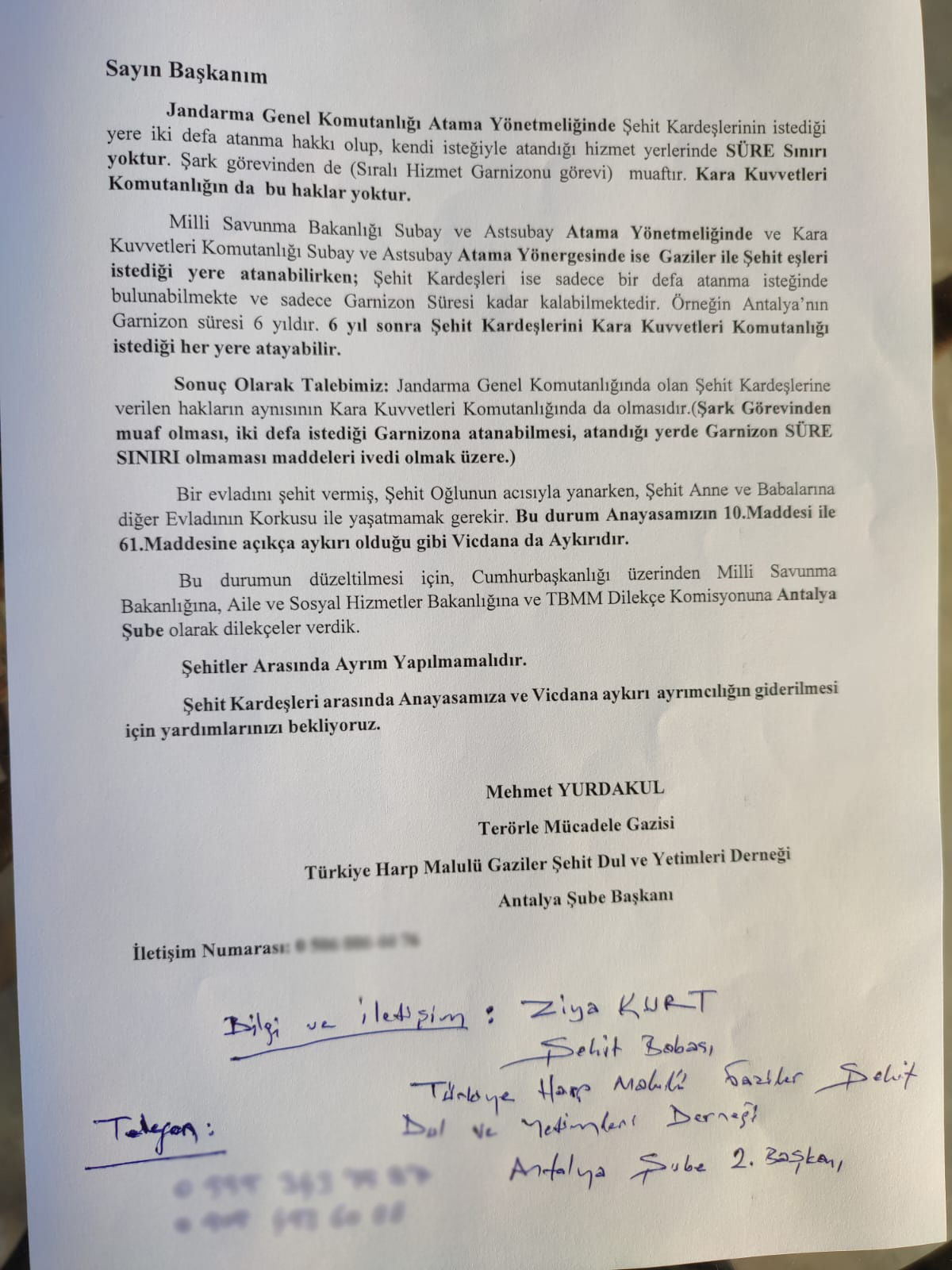 Türkiye Harp Malulü Gaziler Şehit Dul ve Yetimleri Derneği Antalya Şube Başkanı Mehmet Yurdakul tarafından gönderilen dilekçede, “Jandarma Genel Komutanlığı Atama Yönetmeliğinde Şehit Kardeşlerinin istediği yere iki defa atanma hakkı olup, kendi isteğiyle atandığı hizmet yerlerinde süre sınırı yoktur. Şark görevi olarak bilinen sıralı hizmet garnizonu görevinden muaftır. Kara Kuvvetleri Komutanlığın da bu haklar yoktur. Milli Savunma Bakanlığı Subay ve Astsubay Atama Yönetmeliğinde ve Kara Kuvvetleri Komutanlığı Subay ve Astsubay Atama Yönergesinde ise Gaziler ile Şehit eşleri istediği yere atanabilirken; Şehit Kardeşleri ise sadece bir defa atanma isteğinde bulunabilmekte ve sadece Garnizon Süresi kadar kalabilmektedir. Örneğin Antalya'nın Garnizon süresi 6 yıldır. 6 yıl sonra Şehit Kardeşlerini Kara Kuvvetleri Komutanlığı istediği her yere atayabilir” ifadeleri yer aldı.