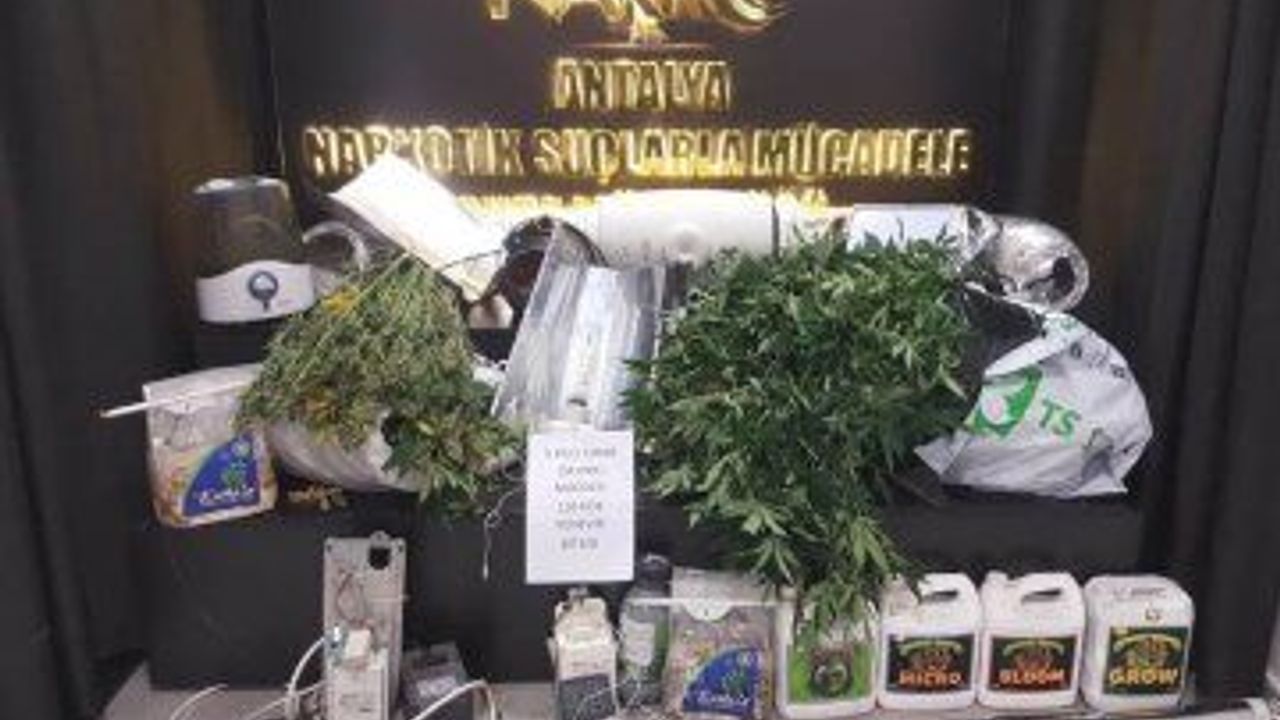 Antalya'da polisin yaptığı uyuşturucu baskınında özel ışıklandırma ve ısıtma - soğutma sistemleriyle uyuşturucu serası haline getirilmiş müstakil evde 110 kök kenevir bitkisi, 5 kilogram skunk (esrar) maddesi ve 1 adet hassas terazi ele geçirildi