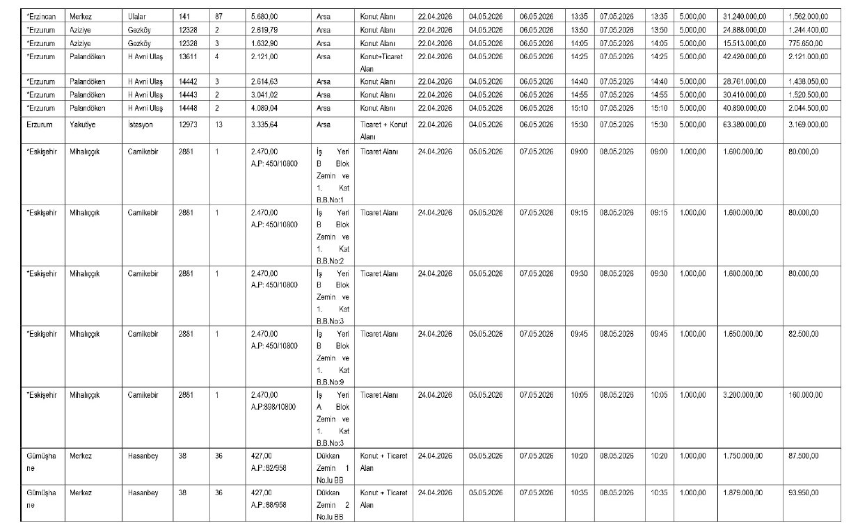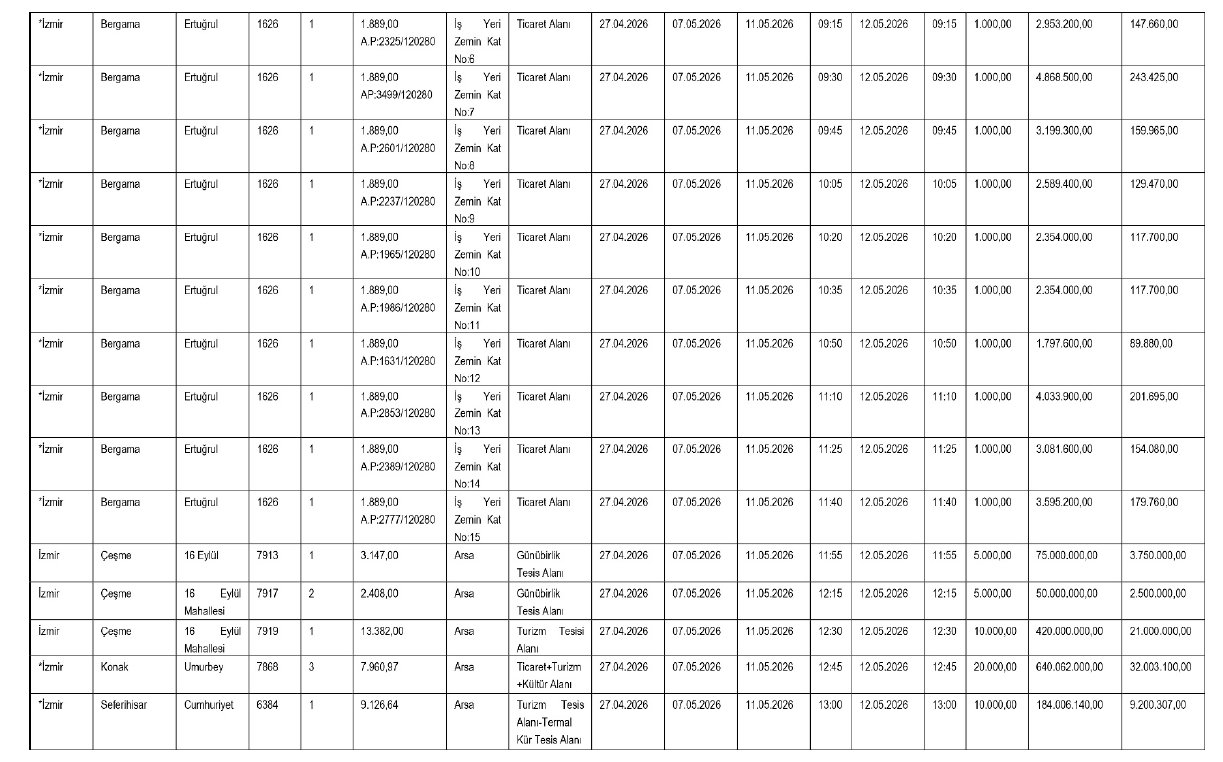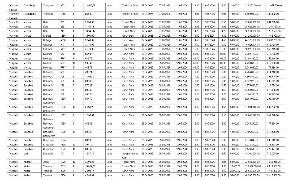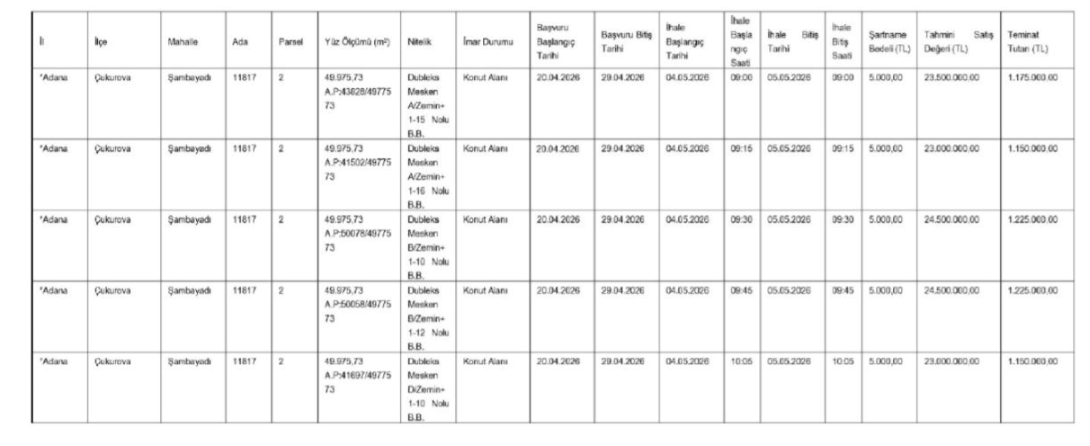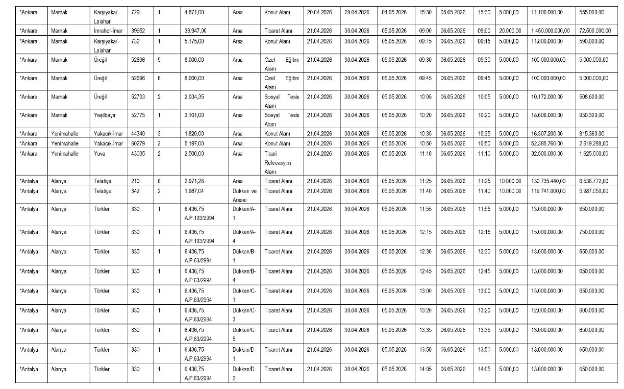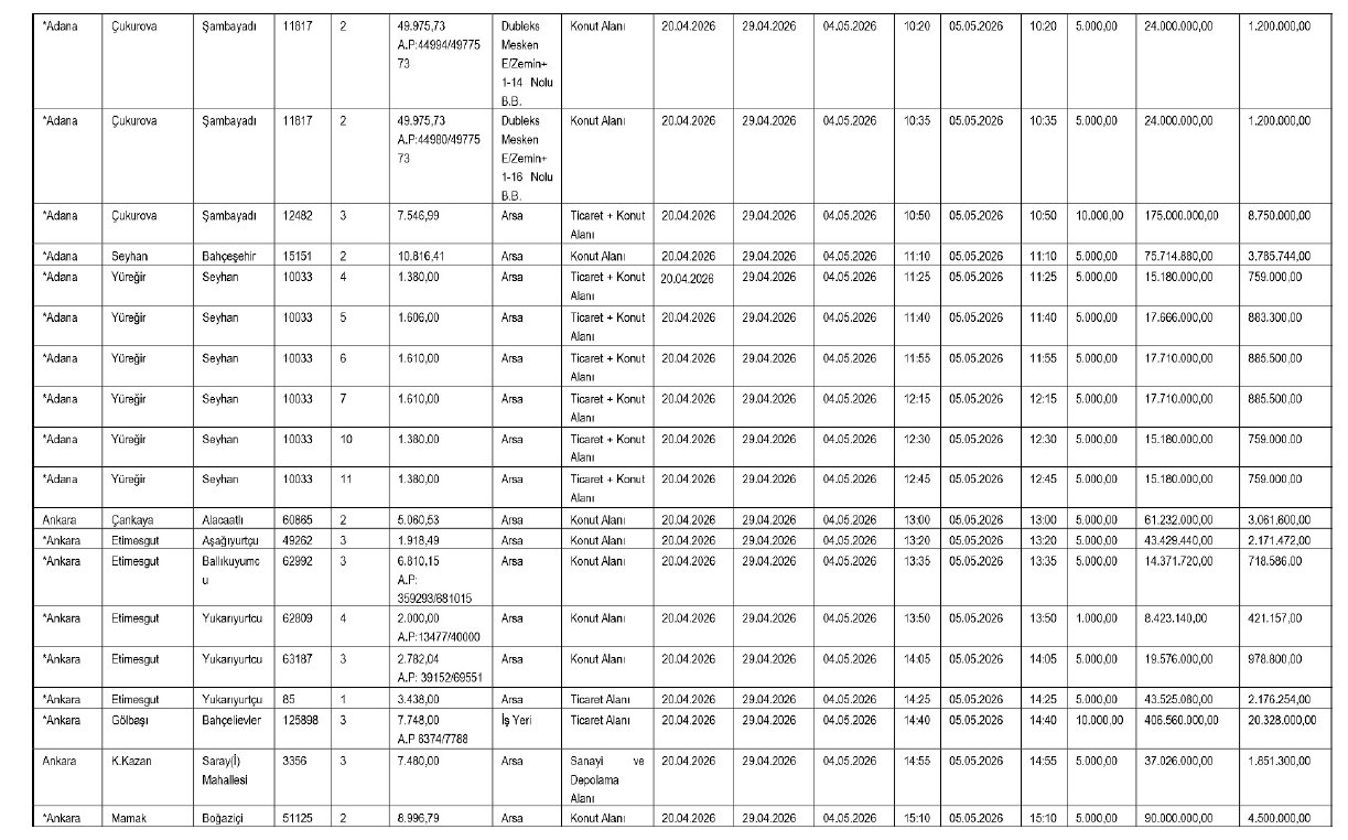 14 Nisan 2026 tarihli Resmi Gazete'de yayımlanan ilana göre, ihale kapsamında Adana Çukurova’da lüks dubleks meskenler 23 milyon TL’den başlayan fiyatlarla satışa sunulurken Ankara Mamak’ta ticaret alanı niteliğindeki dev bir parsel için 1 milyar 450 milyon TL tahmini bedel belirlendi. Başkentte ayrıca Gölbaşı’nda 406 milyon TL değerinde iş yerleri ve Yenimahalle’de konut alanları da yatırımcıların takibinde.