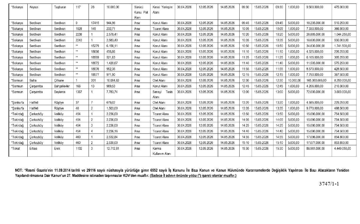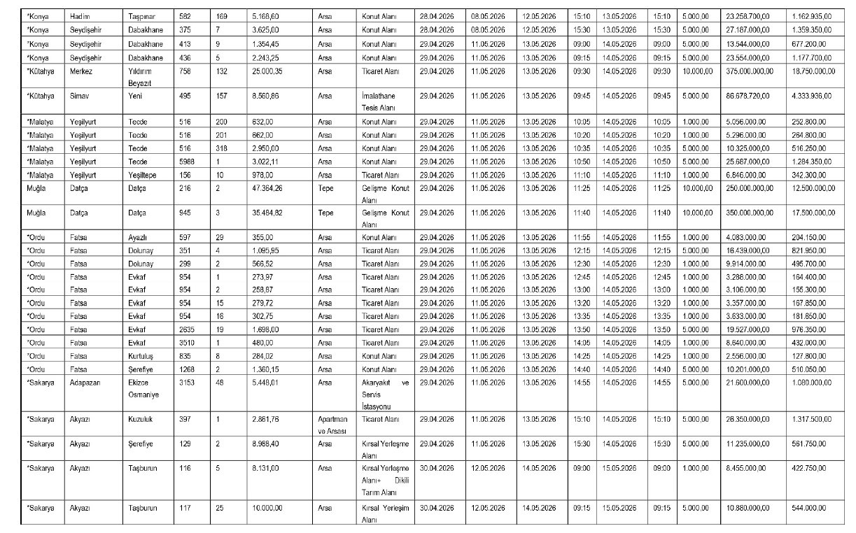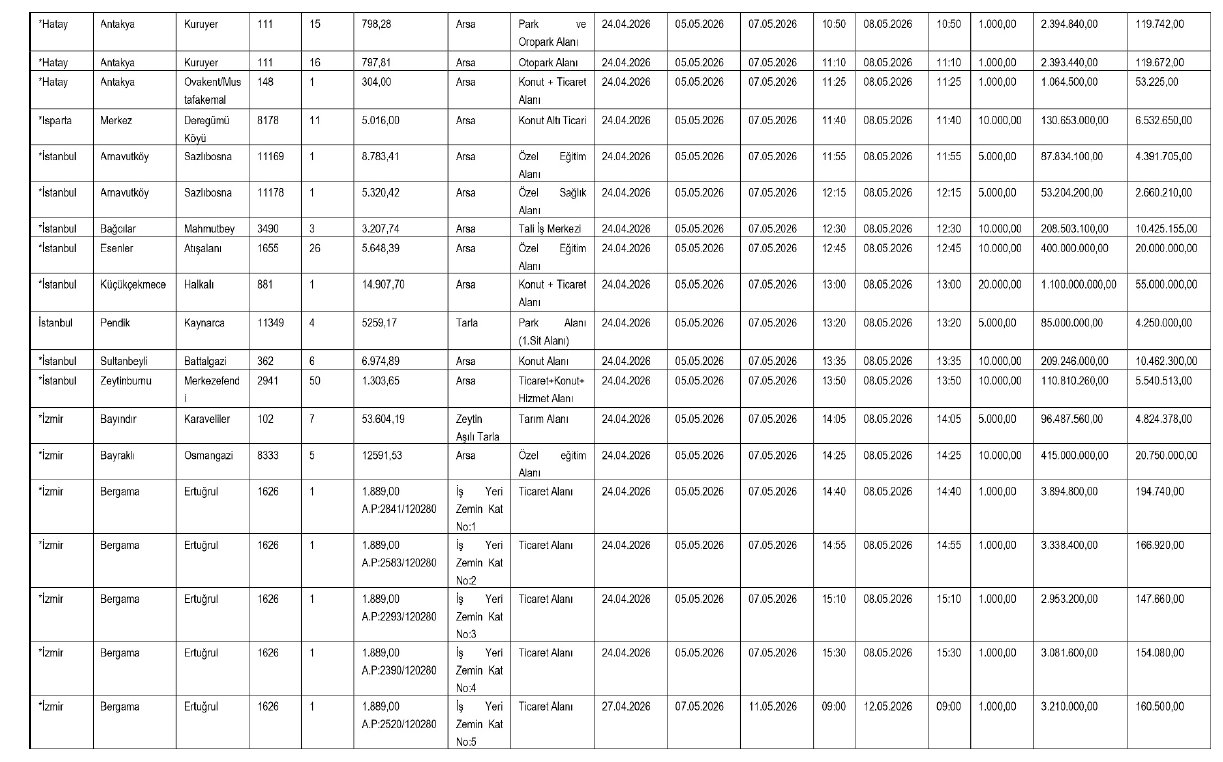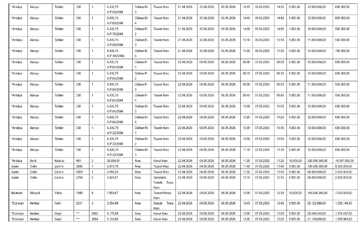 Satış listesinin en dikkat çekici kısmını ise turizmin kalbi Antalya oluşturuyor. Antalya özelinde Alanya ve Serik ilçelerindeki taşınmazlar, yüksek yatırım potansiyelleriyle listenin üst sıralarında yer alıyor.