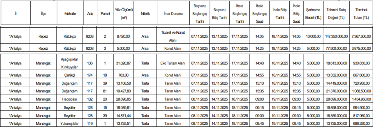 SOSYAL Güvenlik Kurumu (SGK) Başkanlığı, mülkiyetinde bulunan gayrimenkulleri elektronik ortamda açık artırma usulü ile satışa çıkarıyor. Cumhurbaşkanlığı Kararı ile Resmi Gazete'de yayımlanan ilana göre, 17-28 Kasım 2025 tarihleri arasında gerçekleştirilecek büyük ihale listesinde, özellikle yatırımcıların gözdesi olan Antalya'nın Kepez ve Manavgat ilçelerinden toplam 10 adet değerli taşınmaz yer alıyor.