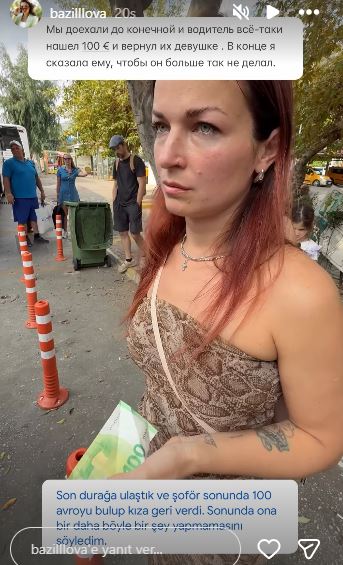 Konu ile alakalı sosyal medya hesabından videolu bir paylaşım yapan Anara Bazillova, “Alanya'da otobüse binerken gördüm ki bir kız şoföre 100 euro, 50 TL vermiş. Ona sormaya karar verdim çünkü parayı yanlış aldığını düşündüm. Hemen şoföre yaklaştık ve geri dönmesini istedik. ‘Hiçbir şey almadım’ diye bağırmaya başladı ve bizi otobüsten attı. Koltuklarımıza geri döndük ve kız arkadaşım polisi aradı. Bir polis gelip ‘kameraları gösterin’ dediğinde sürücü, 100 euronun bir yere düştüyse onun suçu olmadığını söyledi. Son durağa geldik ve sürücü 100 euroyu bulup kız arkadaşına iade etti. Sonunda ona bunu bir daha yapmamasını söyledim” dedi.