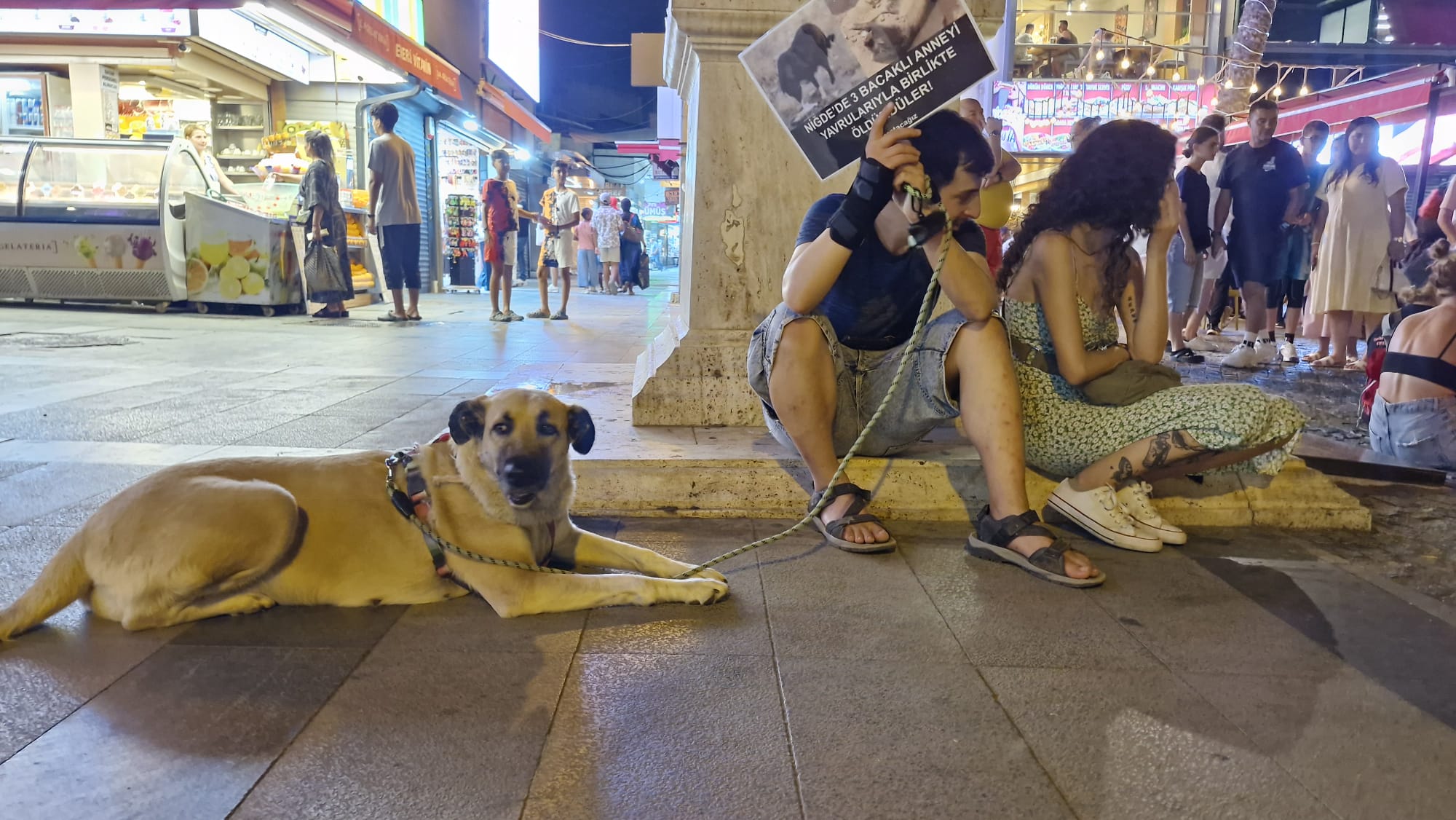 Gönüllü aktivist Özlem Gezirici, “Konya Barınağı’nda başına kürekle vurularak öldürülen köpeğimiz, Elazığ Barınağı’nda veteriner hekimler tarafından açlığa, soğuğa ve işkenceye maruz bırakılıp ölen kedilerimiz ve köpeklerimiz, Niğde Barınağı’nda katledilen canlarımız, Ankara Altındağ Barınağı’nda acımasızca öldürülen köpeklerimiz, Denizli Barınağı’nda hayatlarına son verilen canlarımız, Gebze Barınağı’nda katledilen 45 köpek ve 15 kedi, Ümraniye Barınağı’nda öldürülen dostlarımız, Kütahya’da kalbine ilaç enjekte edilerek yaşamına son verilen 45 köpeğimiz, Burdur Barınağı’nda işkenceye maruz kalan yavrularımız, Osmaniye Barınağı’nda diri diri toprağa gömülen kedilerimiz ve köpeklerimiz, Bursa Osmangazi Barınağı’nda ötenazi ilaçlarıyla katledilen canlarımız, Mamak Barınağı’nda açlığa ve susuzluğa terk edilen köpeklerimiz, Erzincan’da barınak görevlileri tarafından kepçeyle eziyet edilerek diri diri toprağa gömülen köpeklerimiz, Mersin Barınağı’nda tedavi edilmeden, pislik içinde birbirlerini parçalamaya terk edilen; kendi kanları içinde ölü bulunan, ölüleri dahi yerinden alınmayan köpeklerimiz, Gümüşhane Belediyesi tarafından susuz bırakılarak öldürülen köpeklerimiz ve daha adını bilmediğimiz, el altından gizlice öldürülen, işkence gören tüm kedi ve köpeklerimiz bu anlamlı gecede tek tek anıldı. Her bir canı temsilen mumlar yakıldı. Oturma eylemine, kaybedilen arkadaşları ve hâlâ barınaklarda yaşam savaşı veren dostları için direnişin sembollerinden olan Laika, Kivi, Tarçın ve Attalos’un simgesi hâline gelen, bir yıldır tüm eylemlerde yanımızda olan sokakta yaşayan canımız Umut da destek verdi” dedi.