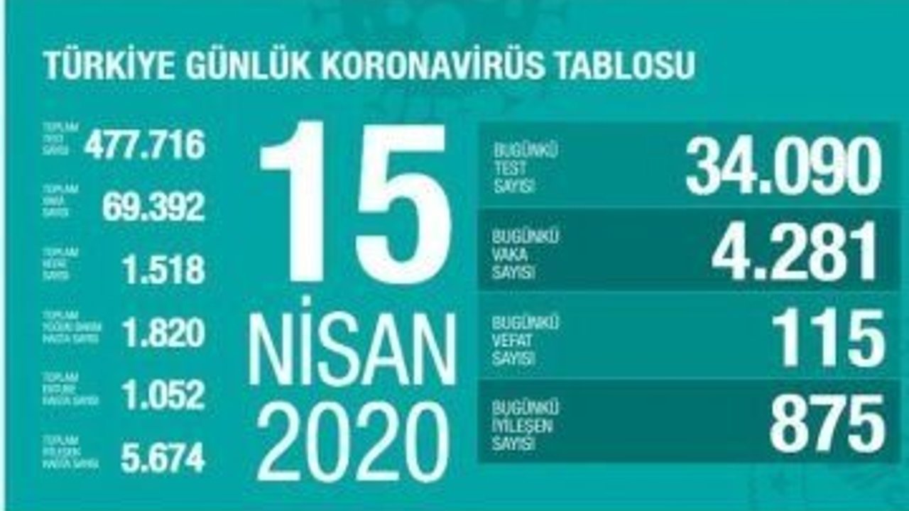 SAĞLIK Bakanlığı, korona virüse ilişkin 15 Nisan 2020 tarihli son verileri açıkladı. Son 24 saatte korona virüs nedeniyle 115 kişinin hayatını kaybettiğini, toplam can kaybının ise bin 518'e yükseldiğini bildirdi. Açıklamaya göre bugün 34 bin 90 test yapılırken, 4 bin 281 yeni vaka tespit edildi. Toplam vaka sayısı 69 bin 392 olurken, bugün iyileşen 875 kişi ile birlikte toplam 5 bin 674 kişi iyileşti. Toplam entübe hastası bin 52 kişi, toplam yoğun bakım hastası bin 820 kişi oldu.