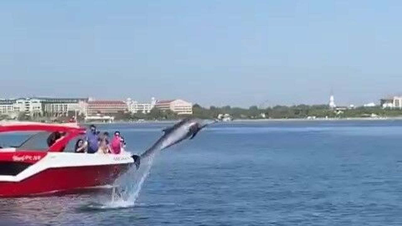 Belek açıklarında tekneyle tur atan turistler, yunusların sürprizi ile karşılaştı. Tekneye yaklaşan yunus, dakikalarca teknenin yanında yüzdü. Yunus, tekneyle yarıştı, sudan çıkıp havada daireler çizdi ve turistlere selam verdi. Yaşanan keyifli anlar, tekne çalışanları ve tatilciler tarafından cep telefonu kameralarıyla kaydedildi.