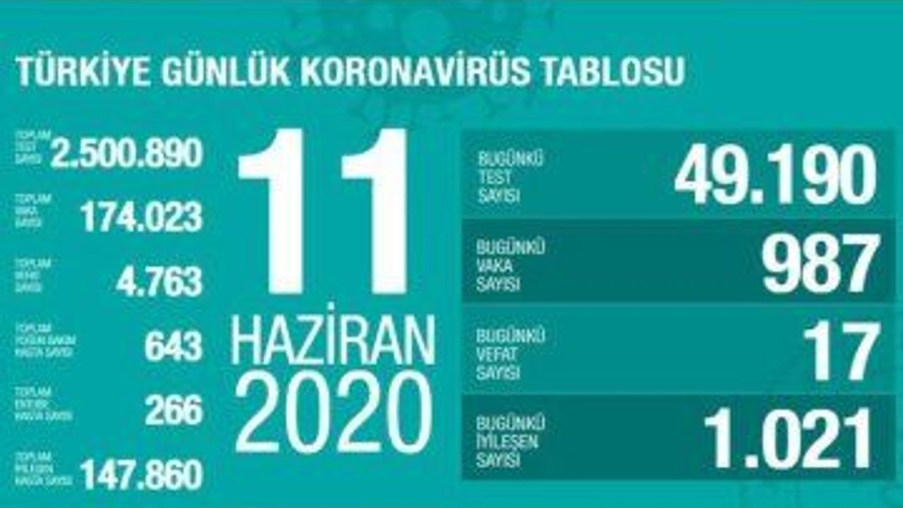 SAĞLIK Bakanlığından yapılan açıklamaya göre, son 24 saatte 17 kişi korona virüsten hayatını kaybetti, toplam can kaybı ise 4 bin 763'e yükseldi. Bugün toplam 49 bin 190 test yapılırken, 987 yeni vaka tanısı konuldu, toplam vaka sayısı ise 174 bin 023 oldu. Bugünkü bin 21 kişiyle birlikte toplam iyileşen sayısı da 147 bin 860'e yükseldi. Toplam entübe hasta sayısının 266, toplam yoğun bakım hasta sayısının ise 643 olduğu açıklandı.