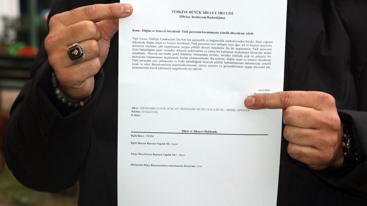 Antalya'da yaşayan ve Türk lirasının manevi değerinin düğünlerdeki takı törenlerinde yapılan yanlış uygulamalarla zarar gördüğünü söyleyen Halit Mert, TBMM Dilekçe Komisyonu'na e-Devlet üzerinden başvuruda bulundu. Halit Mert dilekçesinde düğün, nişan ve benzeri törenlerde Türk lirasının delinmesi, yere atılması ve farklı şekillerde kullanılması gibi uygulamaların paranın fiziki bütünlüğüne ve manevi değerine zarar verdiğini belirterek, bu konuda yasal düzenleme yapılmasını talep etti.