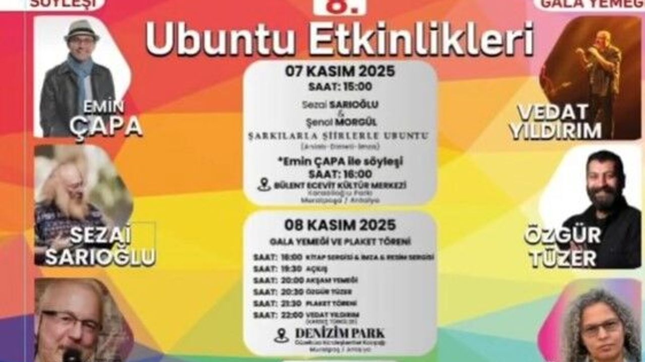 Ubuntu gönüllüleri tarafından geleneksel hale getirilen ve bu yıl sekizincisi düzenlenen Ubuntu etkinlikleri Antalya'nın Muratpaşa ilçesinde 7-8 Kasım tarihleri arasında gerçekleştirilecek. Söyleşiler, dinletiler ve gala gecesiyle dolu dolu geçecek etkinlikte, birbirinden değerli sanatçılar ve konuşmacılar yer alacak.