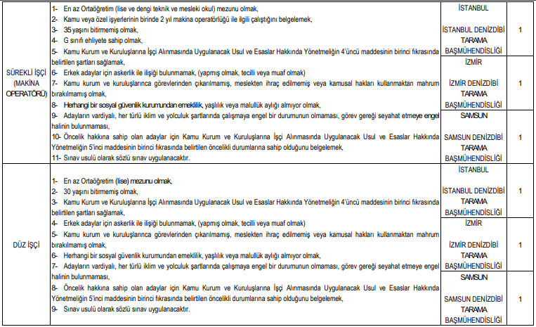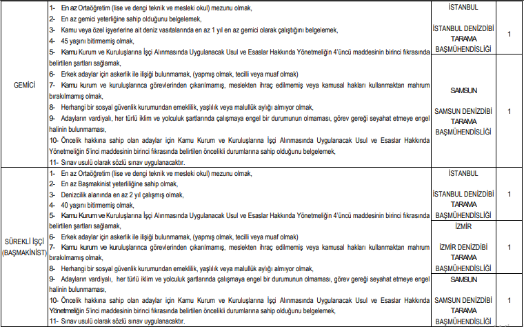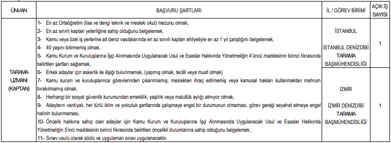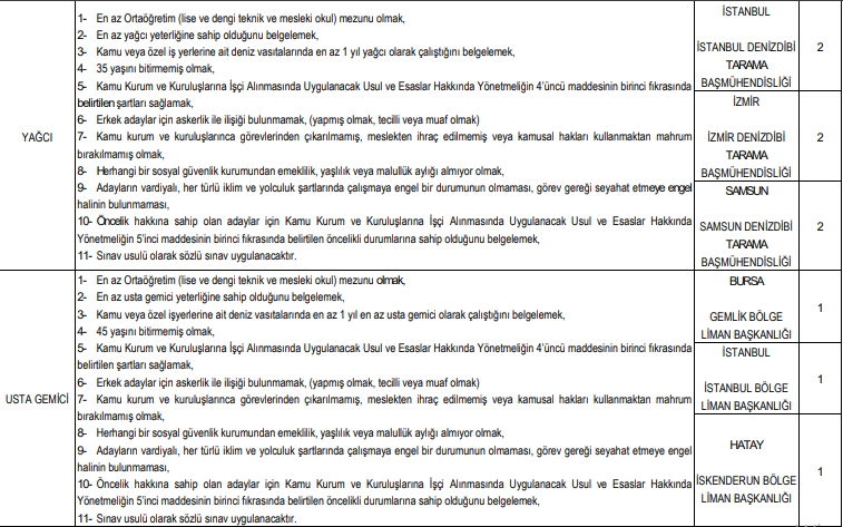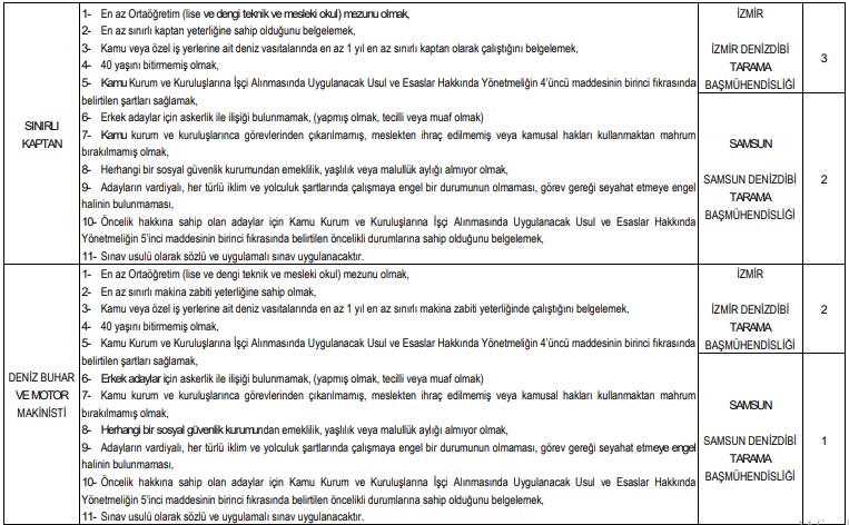 Adayların en az ortaöğretim mezunu olmaları ve pozisyonun gerektirdiği denizcilik yeterlilik belgelerine (kaptanlık, yağcı belgesi vb.) sahip olmaları gerekiyor. Yaş sınırları pozisyonlara göre 30 ile 45 arasında değişiklik gösterirken erkek adayların askerlikle ilişiğinin bulunmaması (yapmış, tecilli veya muaf) şartı aranıyor. Göreve başlayan personel için 60 günlük bir deneme süresi uygulanacak.