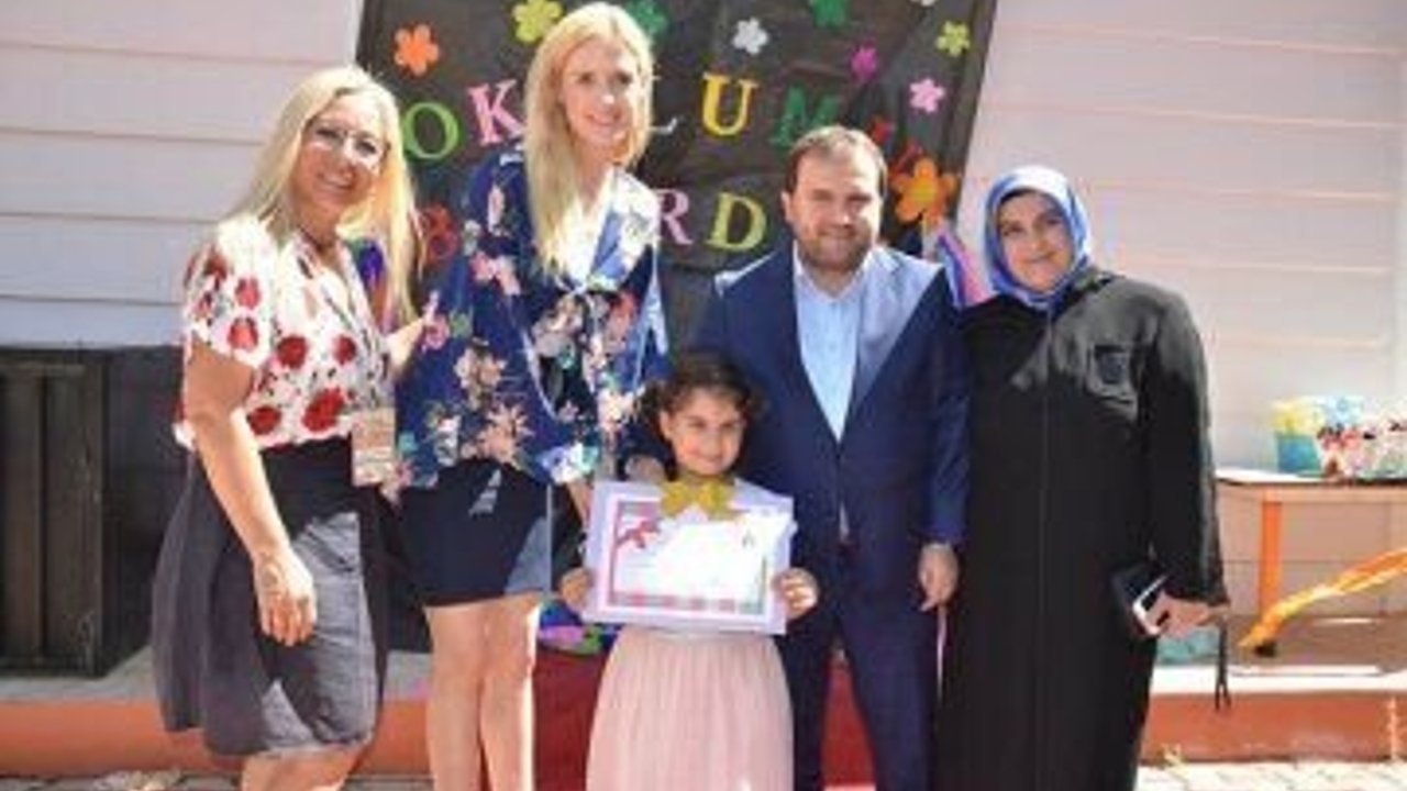 Çanakkale Savaşı'nı anlatan Antalya'nın Akseki ilçesinde çekimi devam eden Mendilim Kekik Kokuyor adlı sinema filminin başrol oyuncularından Wilma Elles, Akseki Aysel Güleç Anaokulunda minik öğrencilere tek tek karne dağıttı.