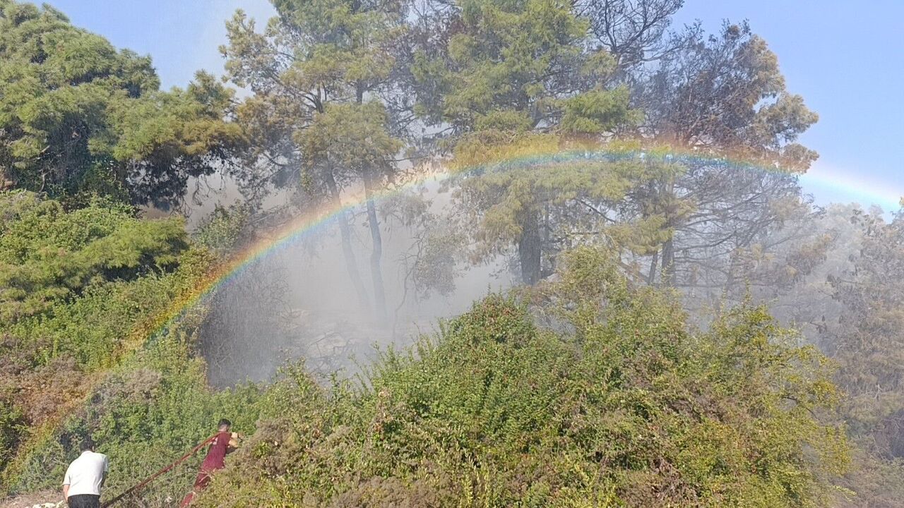 Antalya'nın Manavgat ilçesinde başlayan ve rüzgarın etkisiyle büyüyen yangın, ekiplerin hızlı müdahalesiyle 1 saatte kontrol altına alındı. Söndürme çalışmaları sırasında uçaktan atılan suyun etkisiyle gökkuşağı oluştu