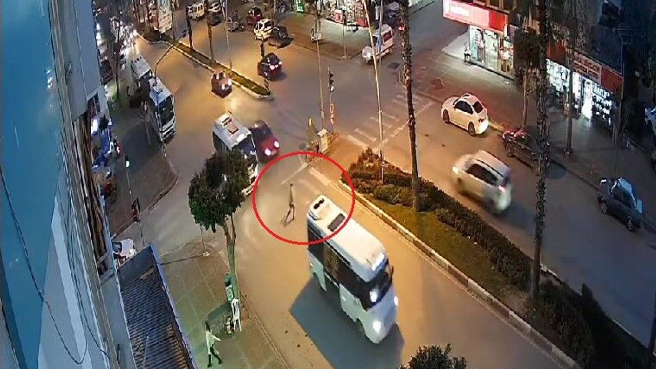 Manavgat'ta yolcu indirmek için duran iki minibüsün arasından koşarak aniden yola fırlayan yayaya otomobil çarptı. Metrelerce havaya savrulan yaya kazada yaralanırken o anlar güvenlik kamerasına yansıdı