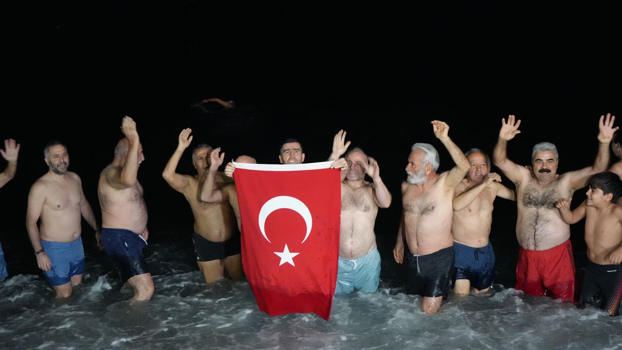 Gece saatlerinde Konyaaltı Sahili’nde bir araya gelen yaklaşık 30 kişilik grup, ellerinde Türk bayraklarıyla geri sayım yaparak yeni yılı denizde karşıladı. Saatler 00.00’ı gösterdiğinde ise grup üyeleri hep birlikte denize girerek 2026 yılının ilk dakikalarını Akdeniz’in serin sularında geçirdi.